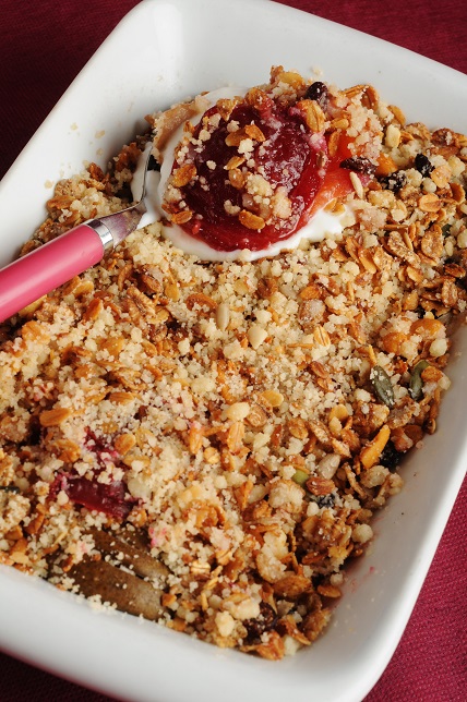 - מפזרים את הקרמבל מעל הפירות ומכניסים לתנור לכ- 20 דקות אשר בסיומם מיצי הפרי אמורים לבעבע.