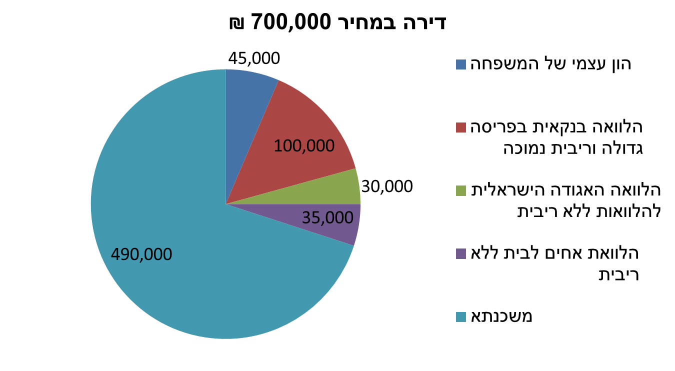 משפחה המגיעה עם 50,000 ₪ הון עצמי צריכה להשיג עוד 160,000 ₪ כדי להשלים רכישה. היא משיגה את המקסימום בהלוואה לכל מטרה כ-100,000 ש"ח בפריסה ארוכה וריביות טובות, ועל גבי זה משלימה באמצעות הלוואות מקרן ההלוואות ללא ריבית כ-35,000 ₪ ומגמ"ח נוסף כ-30,000 ₪ נוספים וכך מצליחים להשלים את הקנייה.
