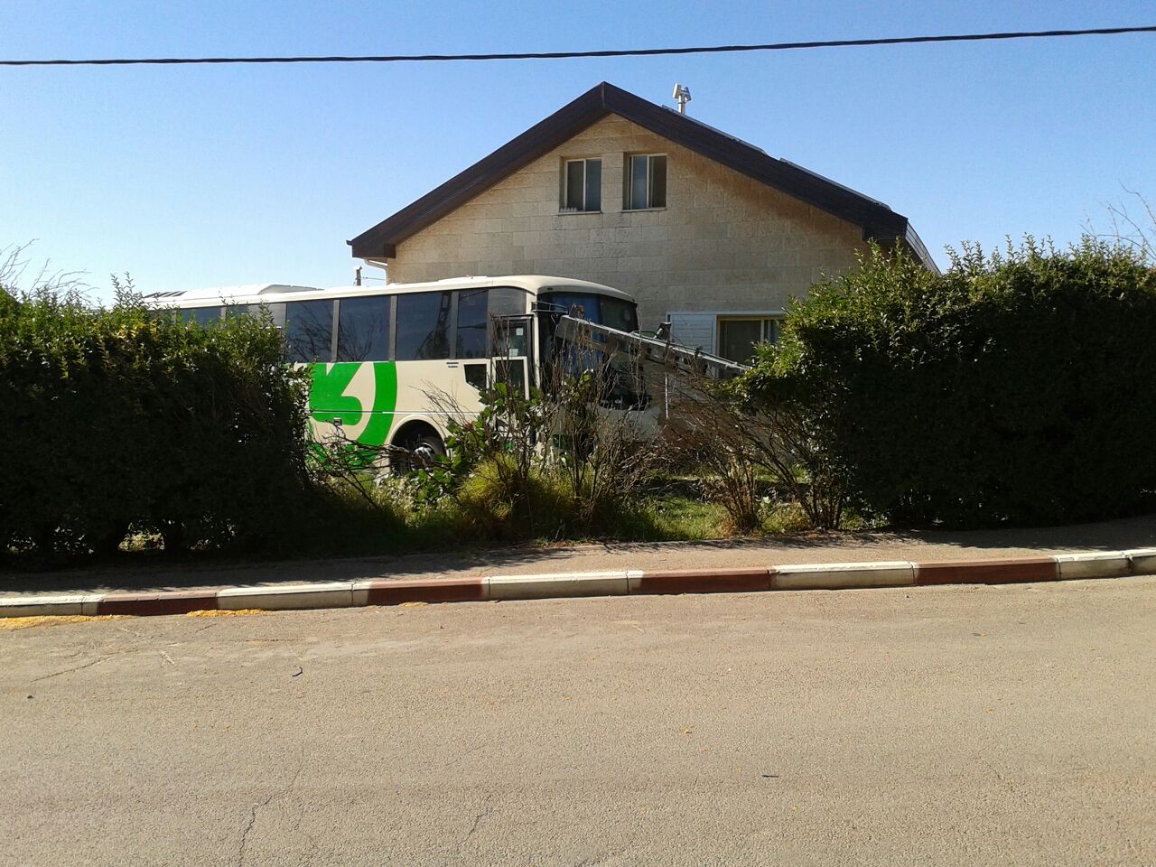 בדרך לחנייה היה עמוד מתח-נמוך של חברת החשמל שהפריע ועמד במסלול הנסיעה, האוטובוס עלה והפיל את העמוד והמשיך בנסיעה עד שנעצר בתוך החצר.