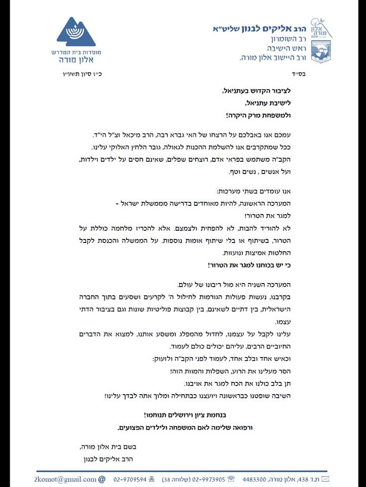 ראש ישיבת אלון מורה ורב היישוב, הרב אליקים לבנון, שיגר מכתב תמיכה וניחומים לתושבי היישוב עתניאל בעקבות האסון הכבד שפקד אותם בסוף השבוע האחרון עם הירצחו של מנהל הישיבה מכאל (מיכי) מרק הי"ד.