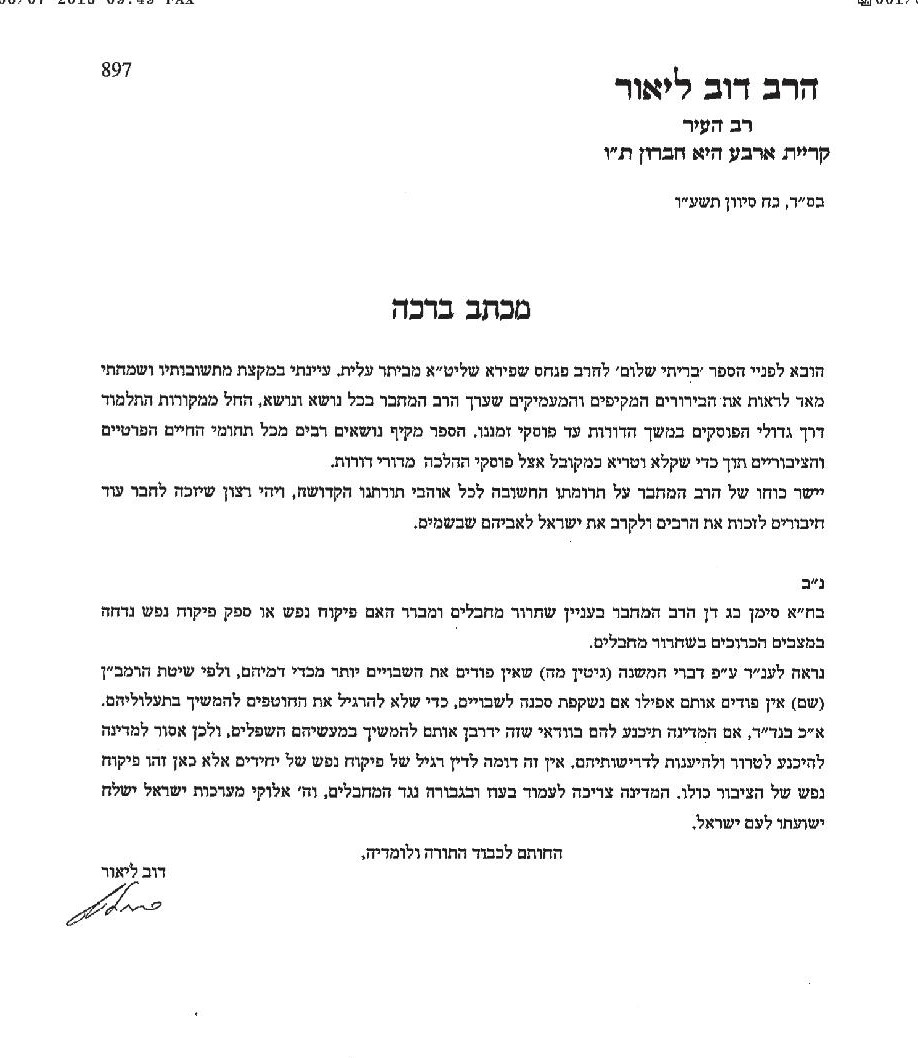 בהסכמה שכתב לספר שו"ת בריתי שלום מאת הרב פנחס שפירא שיצא לאחרונה במהדורה מחודשת, כותב הרב ליאור לגבי סוגיית שחרור מחבלים תמורת חטופים, ועניין פיקוח נפש או ספק פיקוח נפש: