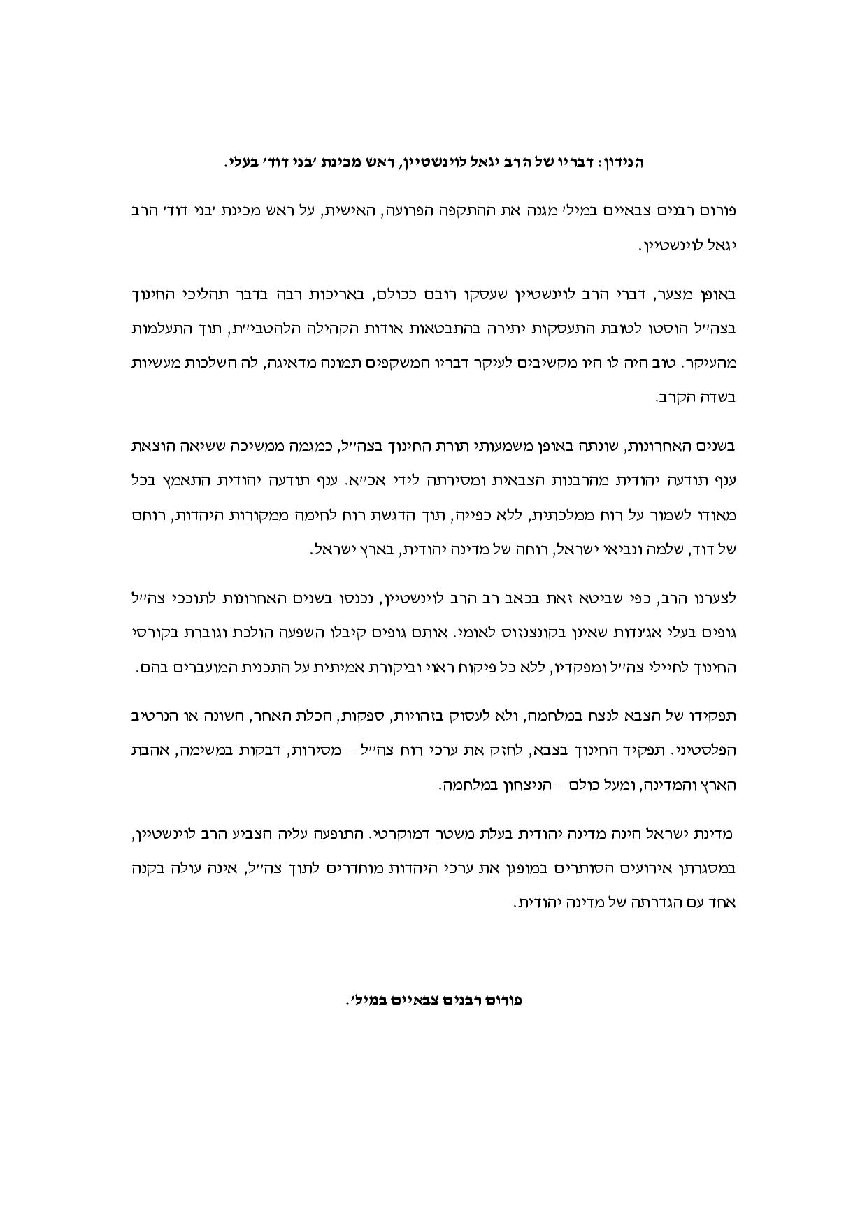 במכתב שהוציאו "פורום רבנים צבאיים במיל'", גוף המאגד כמאה רבנים צבאיים – מרבני גדודים ועד רבני חטיבות ואוגדות במיל', הם מתייחסים לסערה התקשורתית נגד ראש מכינת 'בני דוד' בעלי הרב יגאל לוינשטיין ומכנים אותה "התקפה פרועה ואישית"