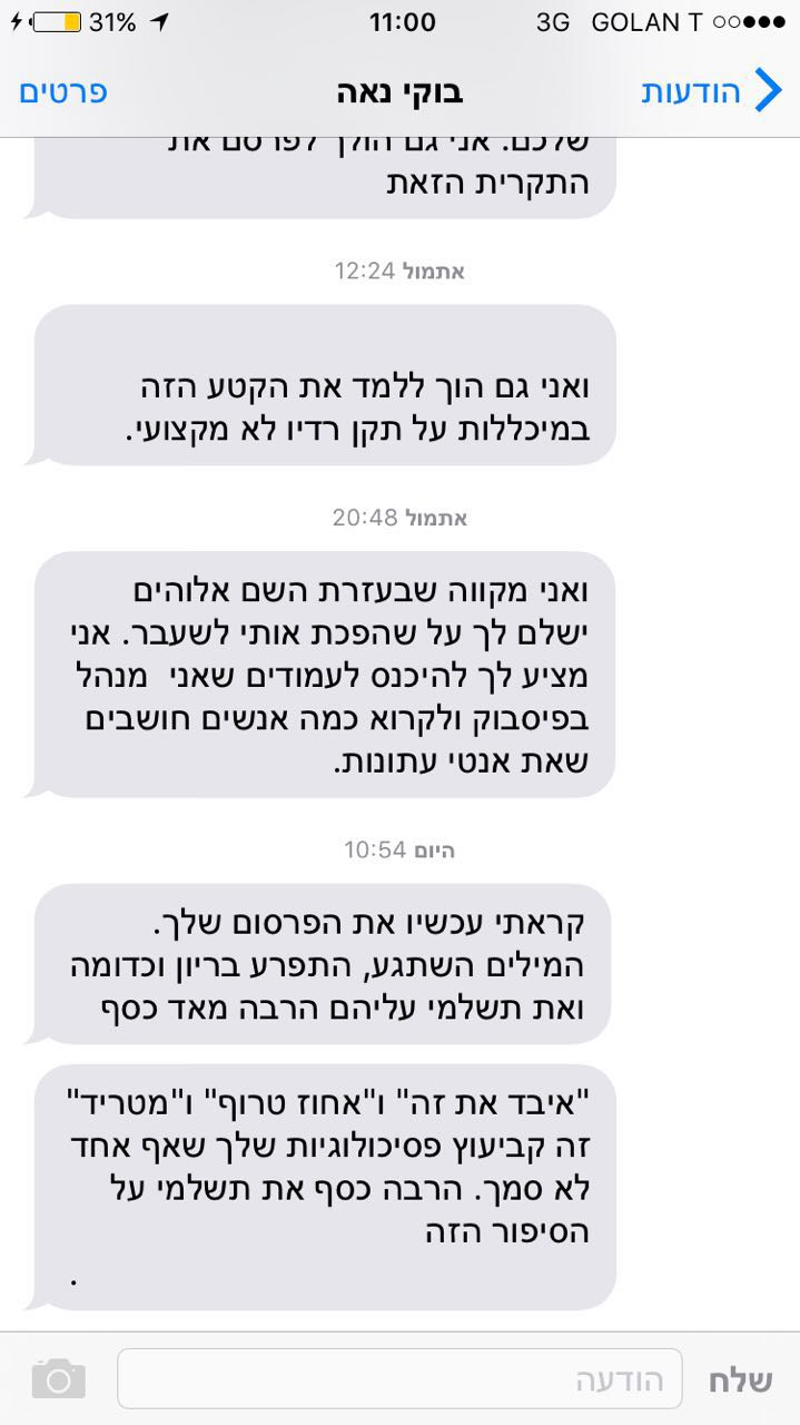 בערב, אחרי 12 שעות, כאילו אין לו חיים, הוא המשיך להטריד אותי בסמס רביעי: "אני מקווה שבעזרת השם אלוהים ישלם לך על שהפכת אותי לשעבר. אני מציע לך להיכנס לעמודים שאני מנהל בפייסבוק ולקרוא כמה אנשים חושבים שאת אנטי עיתונות".