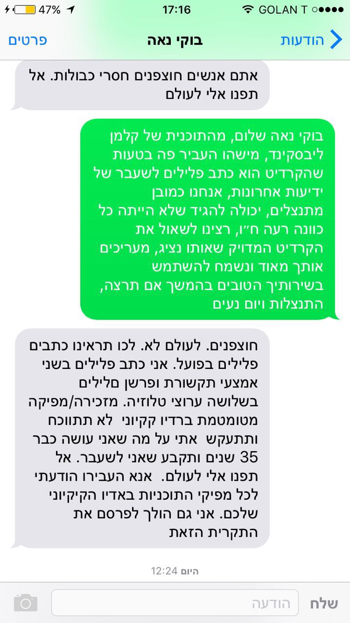 אבל בוקי לא נרגע. אחוז טירוף, הוא שלח לי אחרי עשר דקות סמס שני: "…מזכירה/מפיקה מטומטמת ברדיו קיקיוני לא תתווכח ותתעקש איתי על מה שאני עושה כבר 35 שנה ותקבע שאני לשעבר… אני גם הולך לפרסם את התקרית הזו".