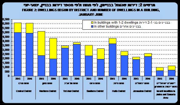 המספר הגבוה ביותר של דירות שהוחל בבנייתן במחצית הראשונה של 2016 נרשם במחוז המרכז, המהווה כ-25% מכלל הדירות, ואילו במחוז ירושלים כ-11% בלבד מסך הדירות. בהשוואה לתקופה המקבילה אשתקד חלה צניחה של כ-35% בהתחלות בנייה במחוז חיפה, ירידה של כ-16% במחוז הצפון ושל כ-11% במחוז הדרום. עלייה של כ-18% בהתחלות הבנייה נרשמה במחוז ירושלים, בעוד שבמחוז המרכז כמעט ולא חל שינוי.