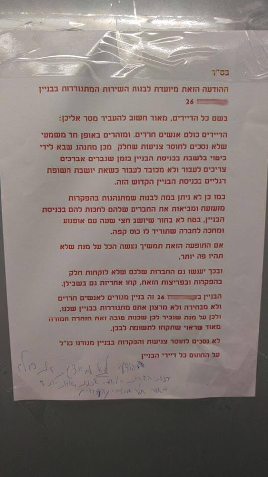 "הדיירים כולם אנשים חרדים, ומזהירים באופן חד משמעי שלא נסכים לחוסר צניעות שחלק מכן מתנהג. שבא לידי ביטוי בלשבת בכניסת הבניין בזמן שגברים אברכים צריכים לעבור ולא מכובד לעבור כשאת יושבת חשופת רגליים בכניסת הבניין הקדוש הזה.