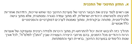 בארגון אספקלריה, מותחים את החוטים גם לקרן החדשה לישראל ומצטטים את יו"ר ועדת המקצוע, ד"ר רון מרגולין, שהתבטא בנושא: "אנו רואים לנגד עינינו את הבוגר הרצוי של מערכת החינוך כמי שחש שייכות, הזדהות ואחריות לתרבותו ולמורשתו היהודית-ישראלית, לא מתוך עמדה סגורה ומסתגרת, אלא מתוך גישה פלורליסטית, פתוחה וביקורתית, ומתוך נאמנות לערכים דמוקרטיים והומניסטיים כלל- אנושיים".