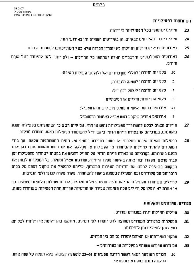 כעת בפקודה החדשה מפורט כי בטקסים כמו יום הזכרון, יום השואה, יום הזכרון ליצחק רבין, טקסי התייחדות חייליים או חטיבתיים, ובביקור רשמי של הרמטכ"ל או אישיות ממלכתית, לא יותר לחיילים להיעדר בשל אורח חייהם.