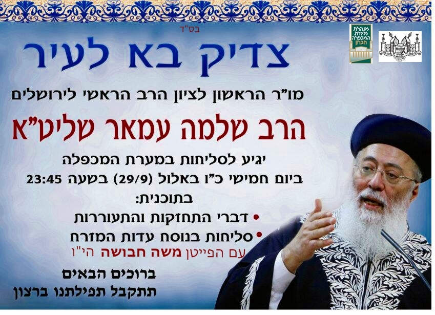 בליל חמישי הקרוב כ"ו באלול 29.9 יגיע הראשון לציון – רבה של ירושלים הרב שלמה עמר שליט"א למערת המכפלה.