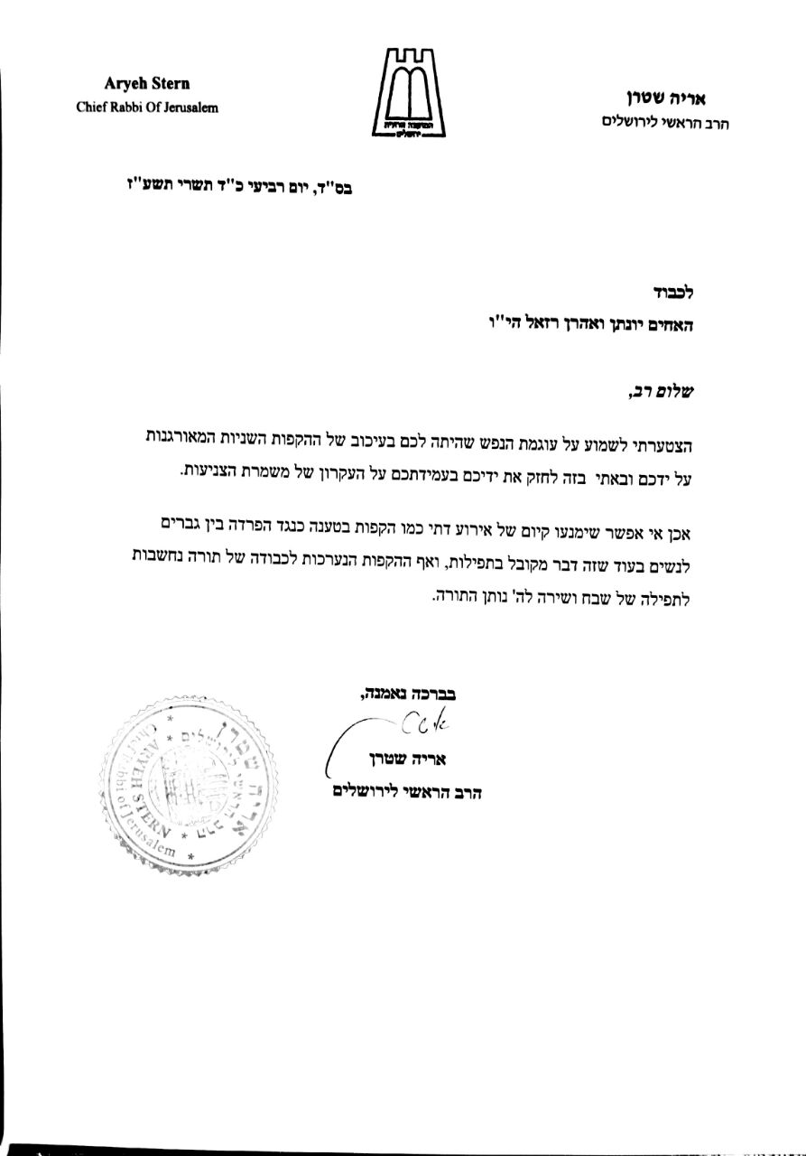 רבה של ירושלים, הרב אריה שטרן שיגר מכתב חיזוק לצמד האחים האמנים יונתן ואהרן רזאל שנאלצו להופיע מול רחבה ריקה בהקפות השניות של מוצאי שמחת תורה.