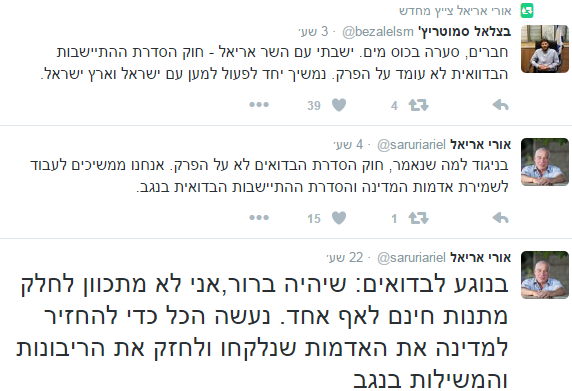 סמוטריץ' כתב את הדברים כתגובה לדבריו של אריאל בחשבון הטוויטר שלו, בו כתב כי "בניגוד למה שנאמר, חוק הסדרת הבדואים לא על הפרק. אנחנו ממשיכים לעבוד לשמירת אדמות המדינה והסדרת ההתיישבות הבדואית בנגב".