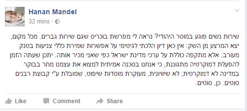 "שירות נשים פוגע במוסר היהודי? נראה לי מפרשת בוכריס שגם שירות גברים.", כותב מנדל הערב (ד'), גם ביחס לעסקת הטיעון של תא"ל אופק בוכריס שהודה בבעילה אסורה בהסכמה ולא ישב בכלא.