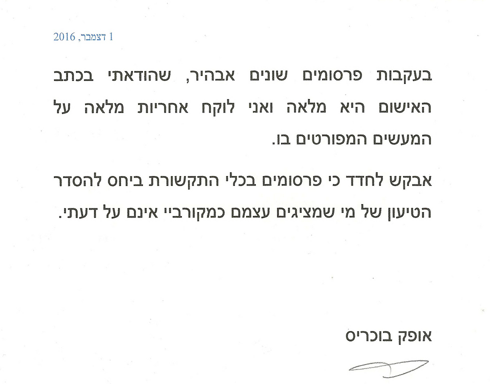 כחלק מהסדר הטיעון בו הודה תא"ל אופק בוכריס בבעילה בהסכמה של פקודה שלו בתמורה למחיקת סעיפי האונס מכתב האישום נגדו, הוא מסר היום (ה') הודעה בכתב בה הוא מודה במיוחס לו.