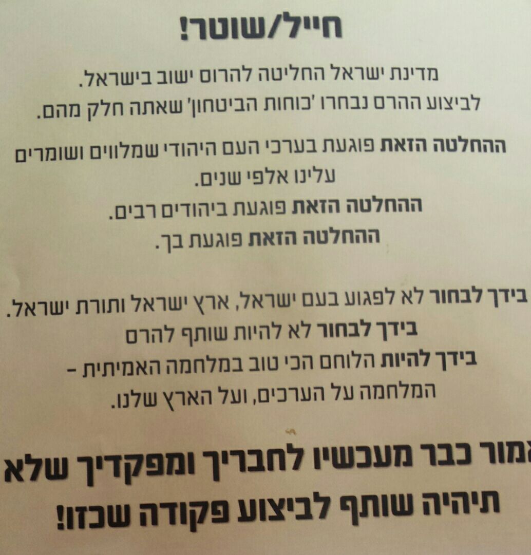 בפלאייר שהמשטרה טוענת כי חולק בידי הקטינים נכתב על רקע הכנות צה"ל והמשטרה לפינוי עמונה: "חייל/שוטר! מדינת ישראל החליטה להרוס ישוב בישראל. לביצוע ההרס נבחרו כוחות הביטחון שאתה חלק מהם. ההחלטה הזאת פוגעת בערכי העם היהודי שמלווים ושומרים עלינו אלפי שנים, ההחלטה הזו פוגעת ביהודים רבים, ההחלטה הזו פוגעת בך. בידך לבחור, לא לפגוע בעם ישראל, ארץ ישראל ותורת ישראל, בידך לבחור לא להיות שותף להרס, בידך להיות הלוחם הכי טוב במלחמה האמיתי – המלחמה על הערכים והארץ שלנו. אמור כבר עכשיו לחבריך ומפקדך שלא תהיה שותף לביצוע פקודה שכזו!".