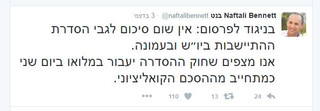 בסביבתם של בנט ושקד אומרים כי בכלל מדובר בהישג בתנאים הנוכחיים. את ההתקפלות של בנט, שאתמול הבטיח שהסעיף הכולל את עמונה ייכלל בחוק, והיום ויתר עליו, הם מסבירים בכך שלקואליציה לא היה רוב להעביר את חוק ההסדרה עם סעיף 7 הכולל את עמונה, בגלל התנגדותו של בני בגין לחוק. "נתניהו לא הצליח לשכנע את בני בגין לא להצביע נגד, וגם כחלון מתבצר בעמדות שלו, ככה שלא הייתה ברירה".