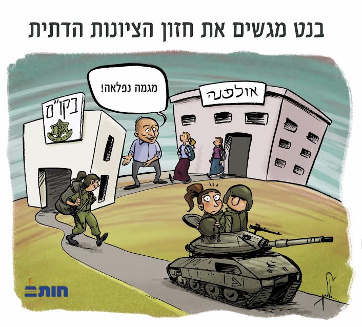 בדף הפייסבוק של הארגון פורסמה קריקטורה בה נראה השר בנט מברך על מגמת הגיוס, ונראות בנות אולפנא המתגייסות ומשולבות בטנק עם חייל.