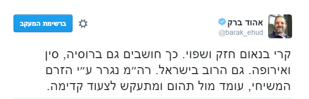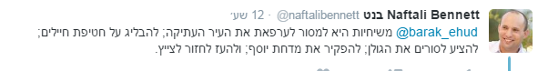 יושב ראש הבית היהודי, השר נפתלי בנט, לא נשאר חייב והגיב לציוץ של ברק: "משיחיות היא למסור לערפאת את העיר העתיקה; להבליג על חטיפת חיילים; להציע לסורים את הגולן; להפקיר את מדחת יוסף; ולהעיז לחזור לצייץ".