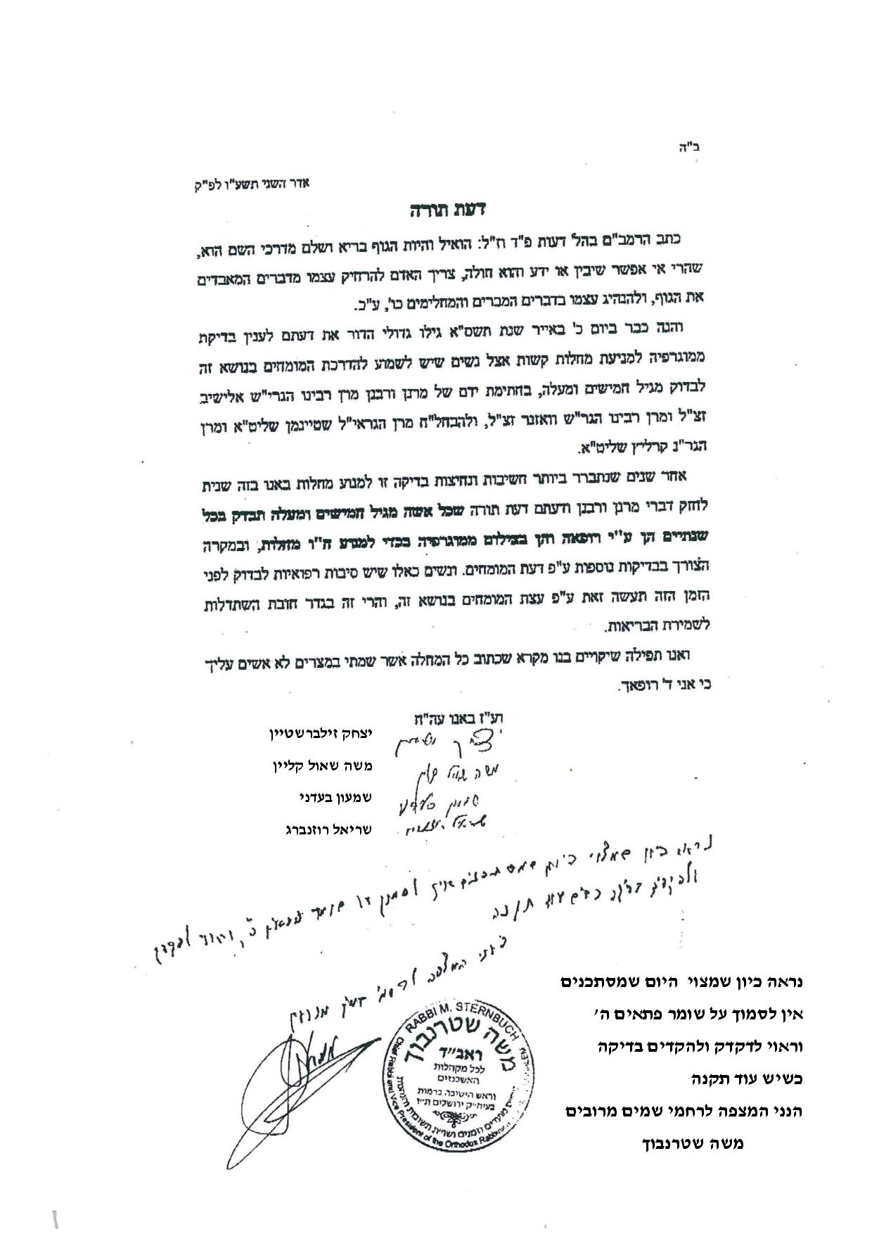 לפני מספר שנים החליט סגן המנהל הרפואי בבית החולים מעייני הישועה, ד"ר מנחם חיים ברייר, להחתים רבנים חרדים כדי שאלה יקראו לנשים לעשות בדיקת ממוגרפיה – הבדיקה הבסיסית לגילוי מוקדם של סרטן השד. לאחרונה הושלמה המלאכה כאשר תשעה מהרבנים בגווני הקשת בציבור הדתי והחרדי חתמו על העצומה.