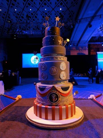 העוגה של אובמה עוצבה דגל ארה"ב- בגוונים בהירים וכהים של כחול שיושבים על בסיס אדום-לבן, עם תוספות של כוכבים נעוצים בראש העוגה, פסים, חותמות צבאיות וסמל נשיאות ארה"ב שקישטו את העוגה .