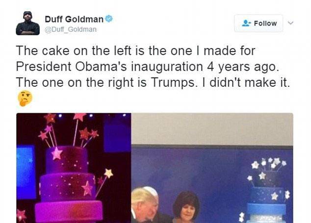 הפדיחה הקולינרית הזו נחשפה בעקבות הפרסום בטוויטר של הקונדיטור דאף גולדמן, ששעיצב והכין את העוגה במיוחד עבור השבעתו של אובמה. גולדמן פרסם את תמונות של העוגות של טראמפ ואובמה וכתב: "העוגה משמאל היא זו שהכנתי להשבעתו של הנשיא אובמה לפני 4 שנים. הימנית של טראמפ. אני לא הכנתי את זה".