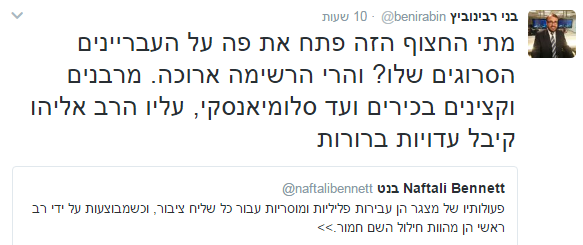 "מתי החצוף הזה פתח את פה על העבריינים הסרוגים שלו?", כתב רבינוביץ' בציוץ אחר. "והרי הרשימה ארוכה. מרבנים וקצינים בכירים ועד סלומיאנסקי, עליו הרב אליהו קיבל עדויות ברורות".