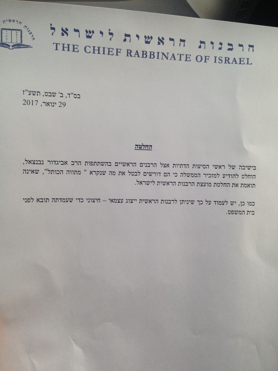 נוסח ההחלטה: "בישיבה של ראשי הסיעות הדתיות והחרדיות ביחד עם הרבנים הראשים לישראל בהשתתפות הרב אביגדור נבנצאל שליט"א הוחלט להודיע לראש הממשלה כי הם דורשים לבטל את מה שנקרא "מתווה הכותל", שאינה תואמת את החלטת מועצת הרבנות הראשית לישראל.