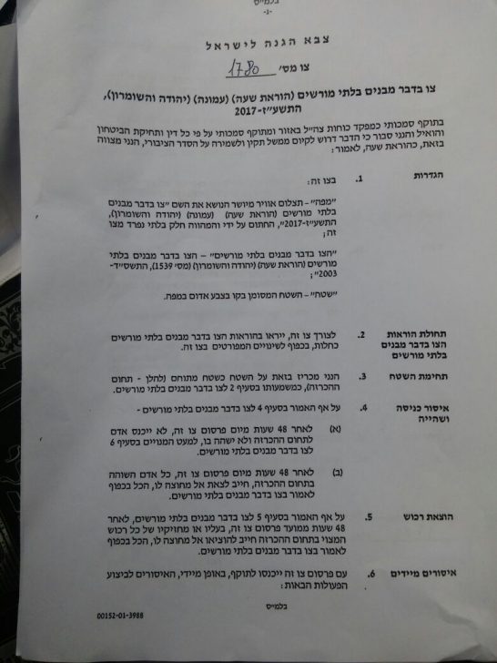 מוקדם יותר הוציא מפקד פיקוד המרכז, אלוף רוני נומה, צו אלוף האוסר כניסה לישוב החל ממחר. על אף שהצווים נתלו הבוקר (ג'), התאריך שנכתב עליהם הוא ה-30 בינואר, כלומר אתמול, והם ייכנסו לתוקף כבר הלילה בחצות.