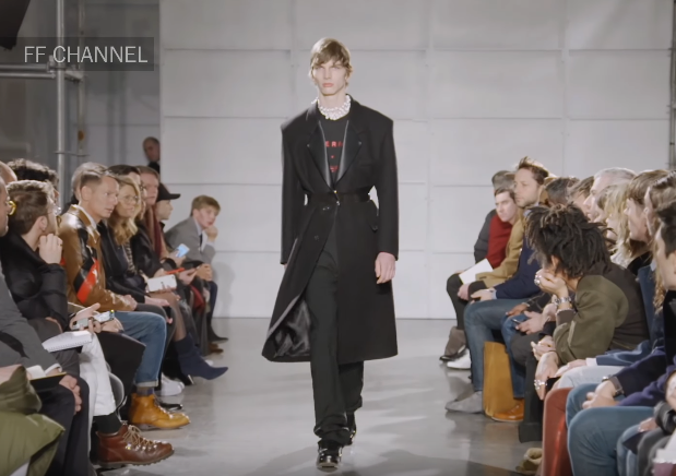 בתצוגה שעיצב סיימונס יחד עם חברת 'קלווין קליין', נראו שלל מעילים באורך מעט מתחת לברך מבדי סטאן וקטיפה מבריקים, עם שילוב שרשראות, סוודרי אוברסייז ועוד שילובים מפתיעים. שחלקם בלתי לבישים בעליל, אבל נראים מדהים על המסלול ומשאירים מין אבק חסידי שיק.