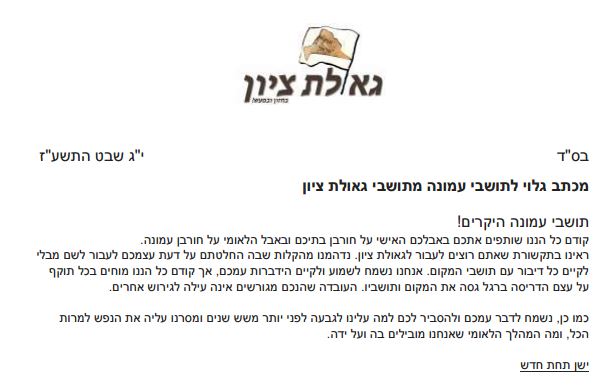 "נשמח לדבר אתכם על אפשרות לשלב אתכם בגאולת ציון, תוך כדי שימת דגש על אופי המקום והמאבק הלאומי הברור על ארץ ישראל שהוא מנהל. אם לא תרצו בכך, מוזמנים לבחור גבעה אחרת מני רבות אחרות שקיימות ביו"ש, שבאמת צריכות את העזרה שלכם. גבעות שוממות שהגיע הזמן ליישב! בהצלחה ביישוב חדש, באמת. ובכל אופן, מוזמנים בשמחה להצטרף למהלך שלנו בגאולת ציון."