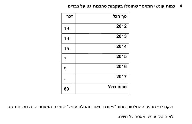 לאור מורכבות התהליך הנתונים מוצגים בחלוקה לבית הדין הרבני הגדול ובתי הדין האזוריים: בין השנים 2012-2017 התקבלו 72 החלטות בבתי הדין האזוריים ו-53 בבית הדין הגדול. מעניין להיווכח כי מספר הגברים שהוטל עליהם עונש מאסר בשל סרבנות גט דומה (או קרוב) למספר הנשים שניתן היתר לבעליהן לשאת אישה שנייה.