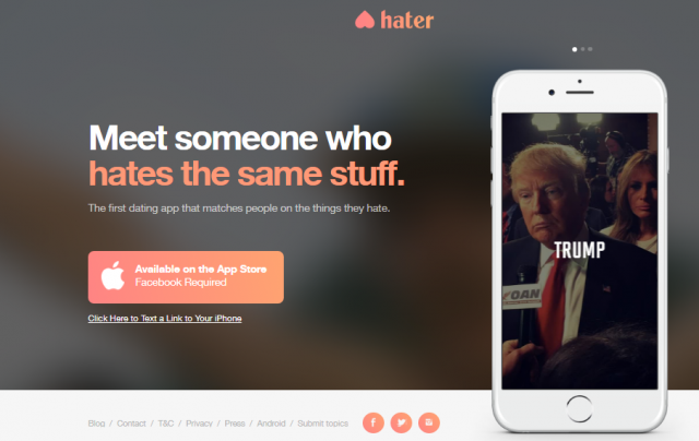 אפליקציה חדשה שהולכת וצוברת תאוצה לאחרונה בשם 'Hater', מציעה לחבר בין אנשים לפי הדברים שהם שונאים. כן נשמע הזוי למצוא אהבה בעזרת שנאה, אך יוצרי האפליקציה טוענים שלפי מחקרים מדעיים שנאות משותפות מסוגלות דווקא להוות בסיס טוב לאהבה.