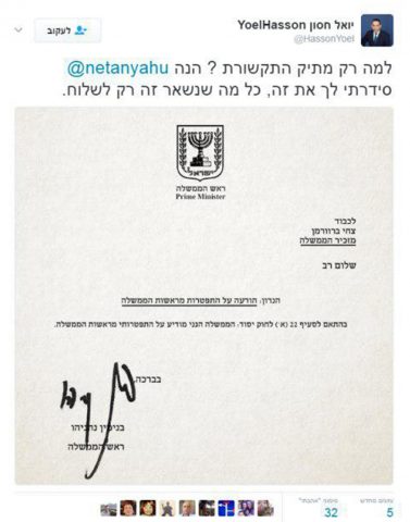 אמש (שני), לאחר התפטרותו של נתניהו ממשרד התקשורת, העלה חסון תמונה של מכתב התפטרות של נתניהו מראשות הממשלה: "למה רק מתיק התקשורת? הנה סידרתי לך את זה. כל מה שנשאר זה רק לשלוח",כתב חסון לנתניהו.