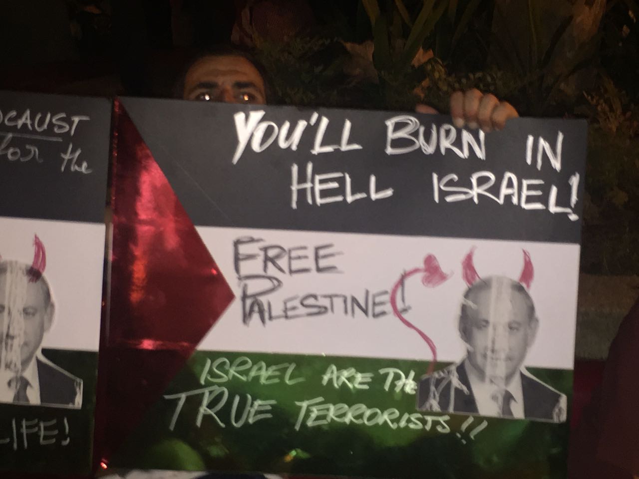 בתמונות נראה נתניהו כשטן, עם שפם של היטלר והמפגינים אוחזים שלטים נגד ישראל ובעד שחרור המדינה הפלסטינית.