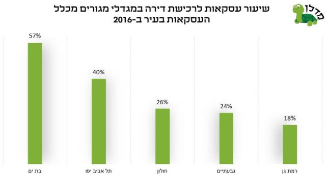 בת ים הובילה בשנה החולפת בהיקף העסקאות לרכישת דירה במגדלי מגורים, עם שיעור של כ-57% מכלל עסקאות הרכישה שבוצעו בעיר. את הסיבה לכך ניתן לייחס לשווק נרחב של דירות שנבנו במגדלי מגורים בחלק הדרום-מערבי של העיר, בשכונת פארק הים (ב-2016 כ-40% מכלל העסקאות לרכישת דירות חדשות בעיר בוצעו באזור דרום מערב העיר).