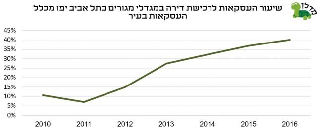 בבחינת העסקאות בתל אביב יפו לאורך השנים האחרונות, ישנה מגמת עלייה מתמשכת בשיעור העסקאות לרכישת דירה במגדלים. אם בשנת 2010 כ-10% מכלל העסקאות בעיר היו לרכישת דירה במגדל מגורים, בשנת 2016 אנו רואים שיא של כ-40% בשיעור העסקאות.