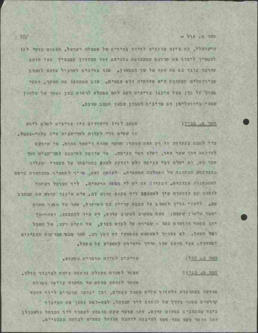 אפשר לעשות פעולה נוספת ביחס לציבור כולו – אפשר לפרסם מטעם 'משרד הדתות' קריאה בצורת מודעה בעתונות, ולחזור עליה מספר פעמים, וכך יגיעו הדברים לידי יותר קוראים מאשר בדרך של לוחות ליד הכותל. לאט-לאט נחנך את הציבור כיצד מתנהגים במקום קדוש. זהו חוסר טקט מובהק לעמוד ליד הכותל המערבי ולאכול; זהו חוסר טקט מצד אשה להיכנס לרחבת הכותל כשהיא לבושה מכנסיים.