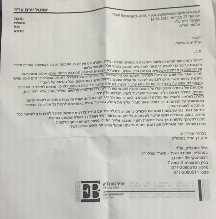 פרקליטו של אלאור אזריה, עורך הדין יורם שפטל, חשף אמש (שלישי) בראיון לעיתונאית דנה סומברג בתכנית "לפני כולם" בערוץ 20, את המייל בו הצהירו עורכי הדין אילן כץ ואייל בסרגליק, אשר פרשו מייצוג הלוחם, כי הפרקליטות הצבאית התחייבה בפניהם שלא להגיש ערעור על עונשו של אלאור אזריה בתנאים מסוימים.