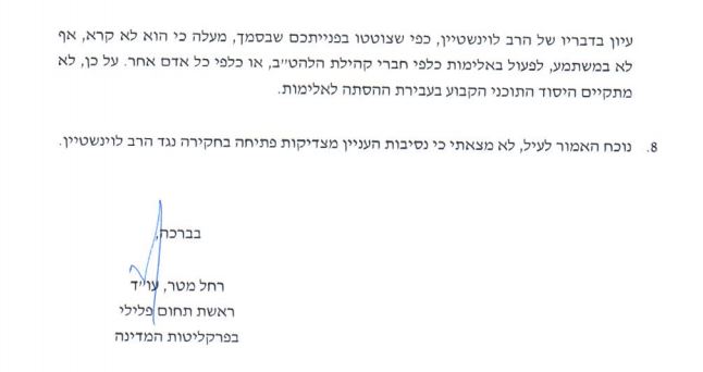 "נוכח האמור לעיל, לא מצאתי כי נסיבות העניין מצדיקות פתיחה בחקירה נגד הרב לוינשטיין." קובעת מטר.