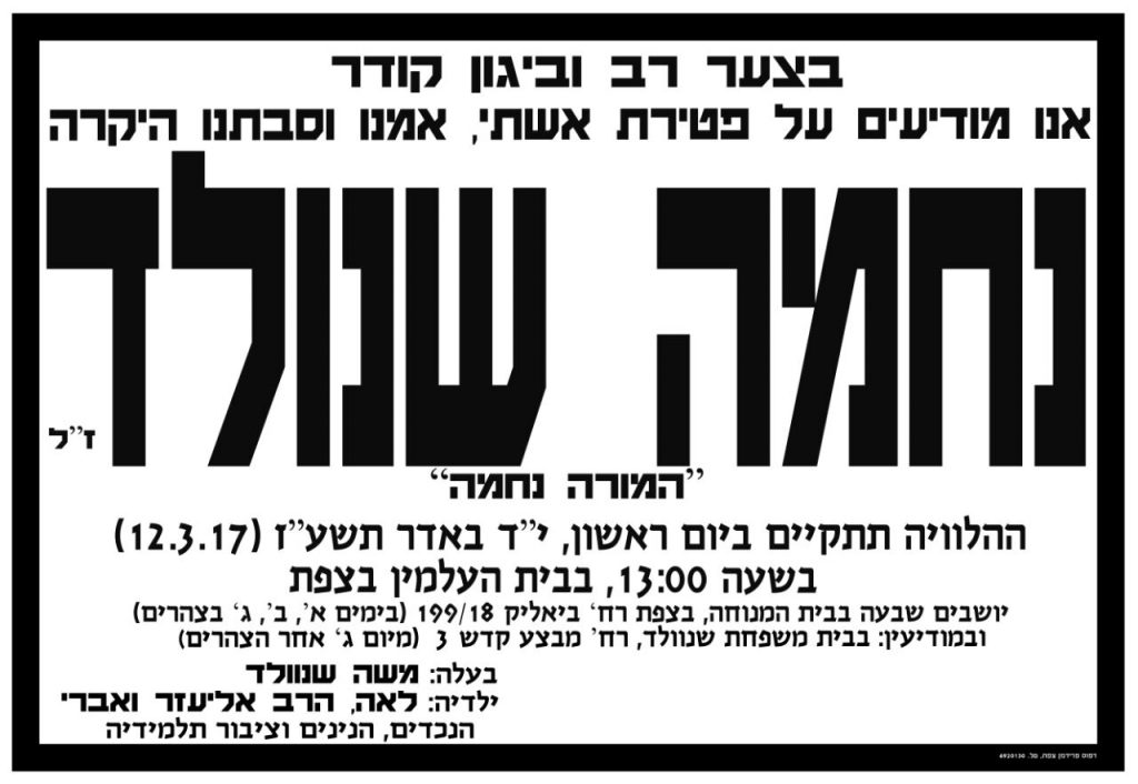 ברוך דיין האמת. נפטרה נחמה שנוולד, אימו של ראש ישיבת ההסדר מאיר הראל במודיעין הרב אליעזר שנוולד. ההלוויה תתקיים היום (ראשון) בשעה 13:00 בבית העלמין בצפת