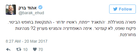 "פשרה מטורללת. ׳התאגיד ייפתח, ראשיו יודחו׳ – התנקשות בחופש הביטוי. פיקוח שופט, לא קומיסר", צייץ ברק בחשבון הטוויטר שלו.