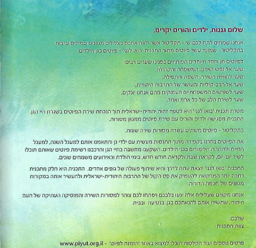 יש תוכנית חדשה במשרד החינוך של פיוטים לגנים. אמנם זה מיועד לכל משרד החינוך אבל כרגע זה נכנס בעיקר לגנים דתיים, כי חילוניים לא מתעניינים בזה. על כל פנים, נראה שבדתיים יש בזה ברכה.