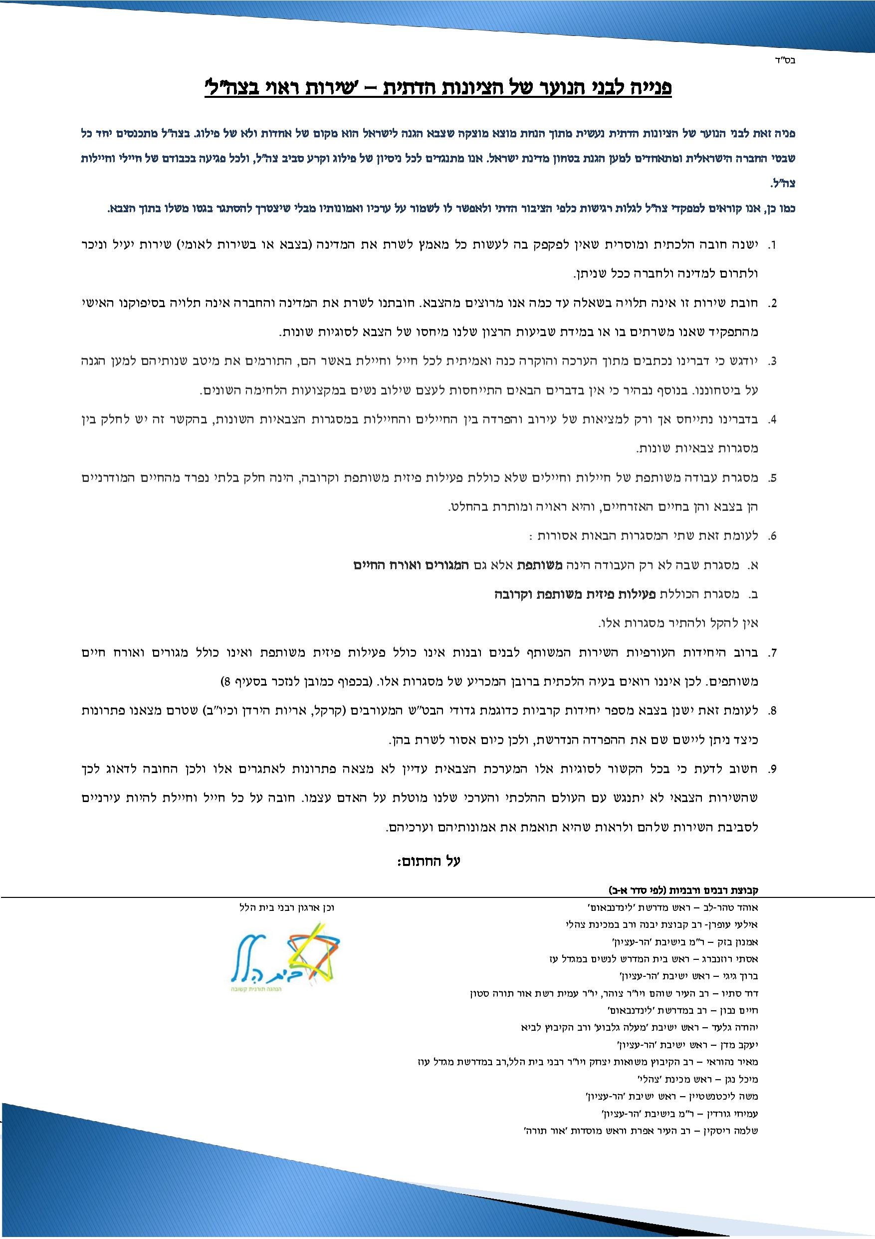את נייר העמדה מפנים הרבנים לבני הנוער של הציונות הדתית, ומציינים כי "הפנייה נעשית מתוך תפיסה מוצקה שצבא הגנה לישראל הוא מקום של אחדות ולא של פילוג. בצה"ל מתכנסים יחד כל שבטי החברה הישראלית ומתאחדים למען הגנת בטחון מדינת ישראל. אנו מתנגדים לכל ניסיון של פילוג וקרע סביב צה"ל, ולכל פגיעה בכבודם של חיילים וחיילות בצבא הגנה לישראל."