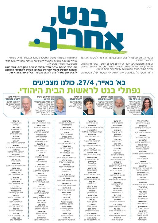 במודעת התמיכה שתתפרסם בעלוני השבת נכתב בין השאר: "בזכות הנהגתו של נפתלי בנט הגענו בשנים האחרונות למקומות עליהם יכולנו רק לחלום".