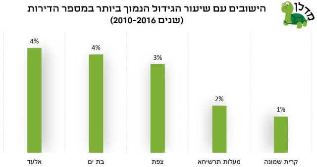 עוד לפי הבדיקה, נמצא שהערים שרשמו שיעור גידול כמעט אפסי במספר הדירות מתרכזות בפריפריה הצפונית: העיר צפת רשמה גידול בשיעור של כ-3% מ-2010, מעלות תרשיחא גידול בשיעור של כ-2% וקריית שמונה גידול בשיעור של כ-1% בלבד במספר הדירות.
