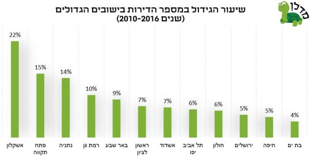 בבדיקת התפתחות הישובים הגדולים, נמצא שאשקלון מובילה בתוספת הדירות החדשות בעיר בשנים האחרונות, עם גידול בשיעור של כ-22%. הגידול המשמעותי בהיצע הדירות בעיר הינו תוצאה של בנייה חדשה בשכונות ברנע, האגמים ונווה הדרים. כך, לפי נתוני אתר מדלן, מ-2010 כ-77% מכלל הדירות החדשות שנמכרו בעיר היו בשכונות אלו.
