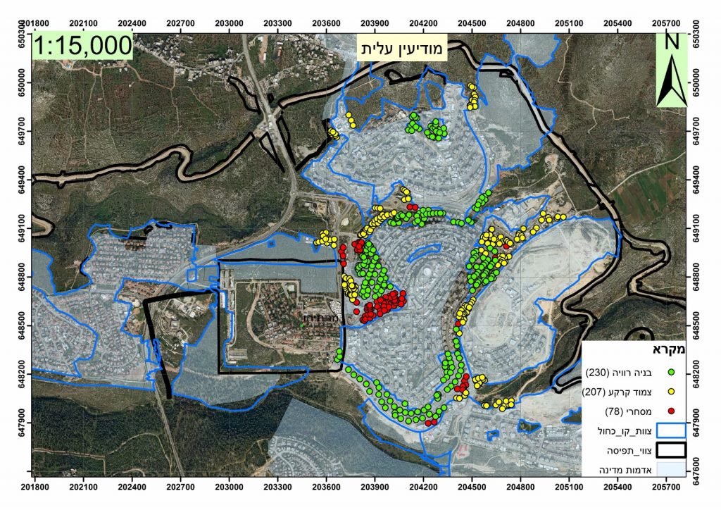 בתמונות: אחד מהבתים ביישוב פסגות, והמחשה למספר המבנים במודיעין עילית, שעליהם חל חוק ההסדרה. ניתן לעשות שימוש בתמונות ללא תמורה. קרדיט צילום: תנועת רגבים.