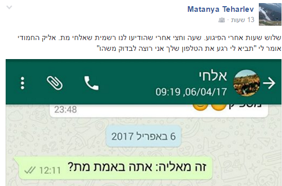בפוסט הקצר, שקצר תוך זמן קצר עשרות שיתופים, סיפר מתניה, ששעות אחרי ההודעה הרשמית שנמסרה למשפחה אודות מותו של אלחי, ביקש ממנו אחיו הקטן את הטלפון "כדי לבדוק משהו".