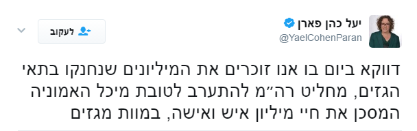 "דווקא ביום בו אנו זוכרים את המיליונים שנחנקו בתאי הגזים, מחליט רה"מ להתערב לטובת מיכל האמוניה המסכן את חיי מיליון איש ואישה, במוות מגזים", כתבה כהן פארן וזכתה למבול של תגובות שהביעו זעזוע מהדברים.