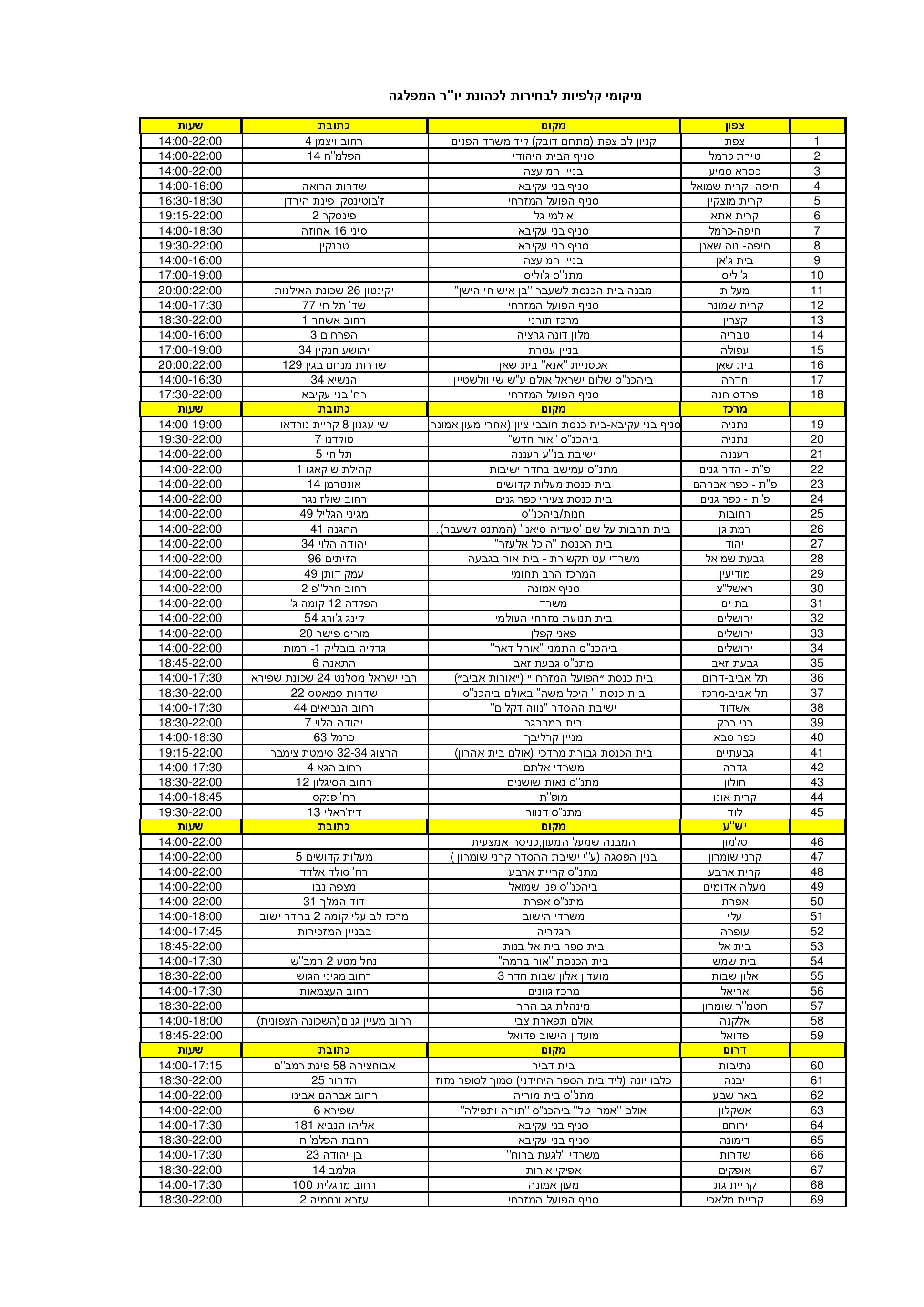 הבחירות לראשות הבית היהודי יתקיימו מחר. הקלפיות ייפתחו בשעה 14:00 ויסגרו בשעה 22:00, במקומות רבים תופעל הקלפי רק בחלק משעות היממה לפי הפירוט הבא: