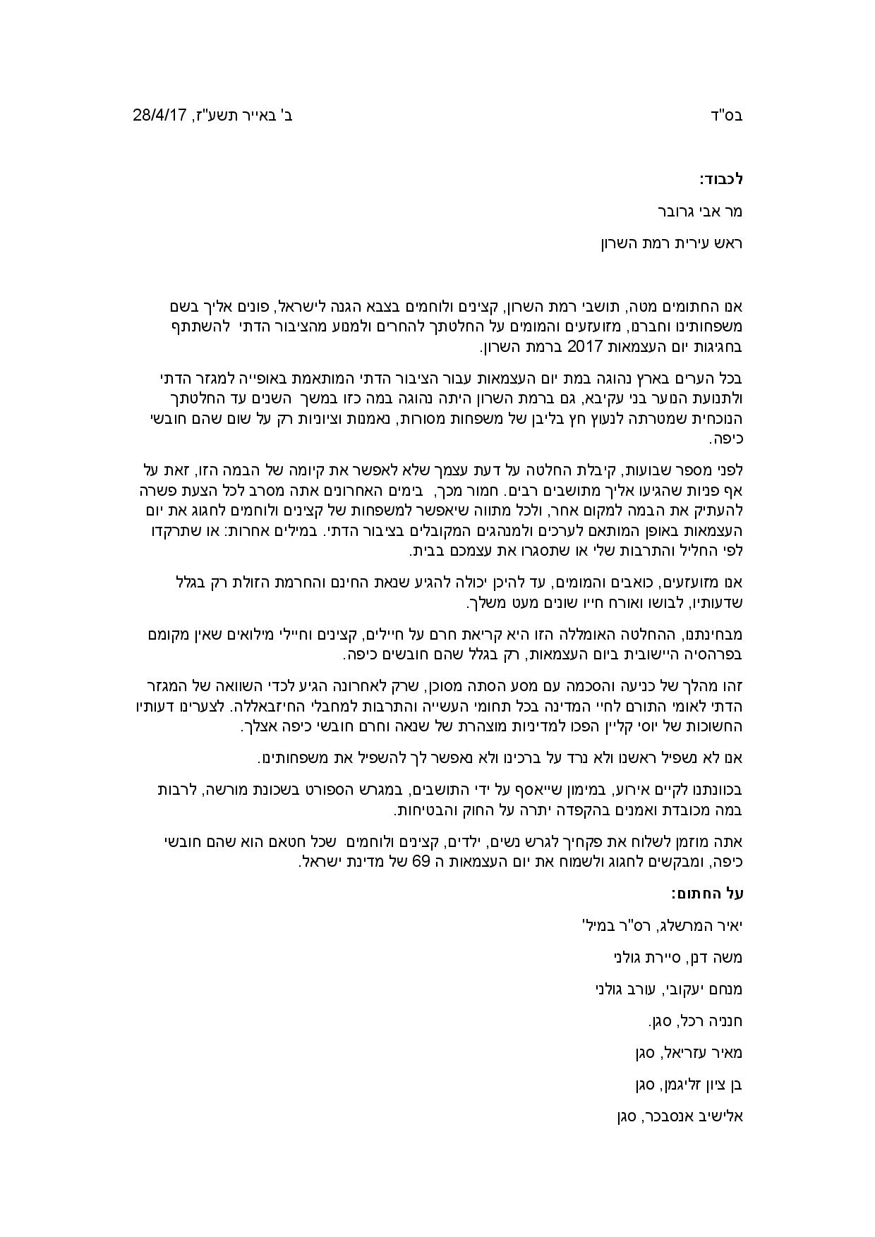 בסוף העצומה, מגבירים החותמים את הטון ומאשימים את ראש העירייה בשנאת דתיים: "אנו מזועזעים, כואבים והמומים, עד להיכן יכולה להגיע שנאת החינם והחרמת הזולת רק בגלל שדעותיו, לבושו ואורח חייו שונים מעט משלך. מבחינתנו, ההחלטה האומללה הזו היא קריאת חרם על חיילים, קצינים וחיילי מילואים שאין מקומם בפרהסיה היישובית ביום העצמאות, רק בגלל שהם חובשים כיפה.